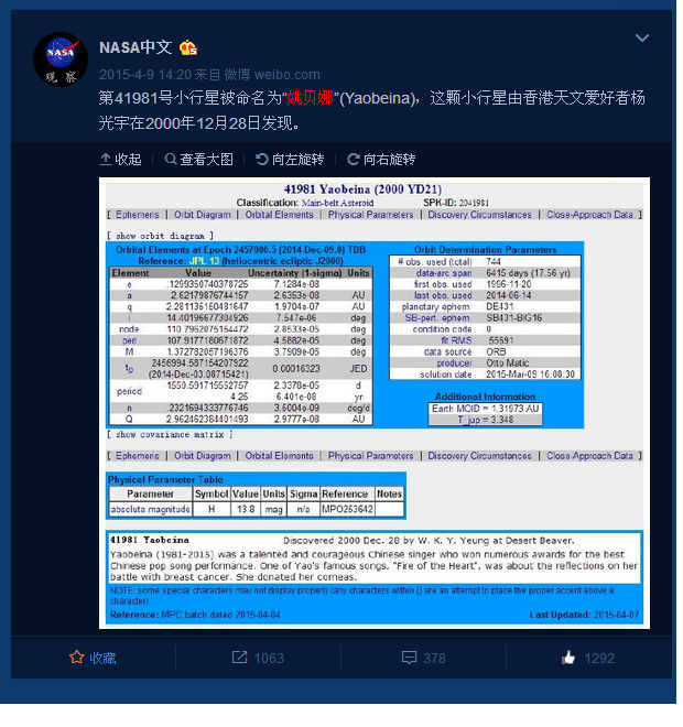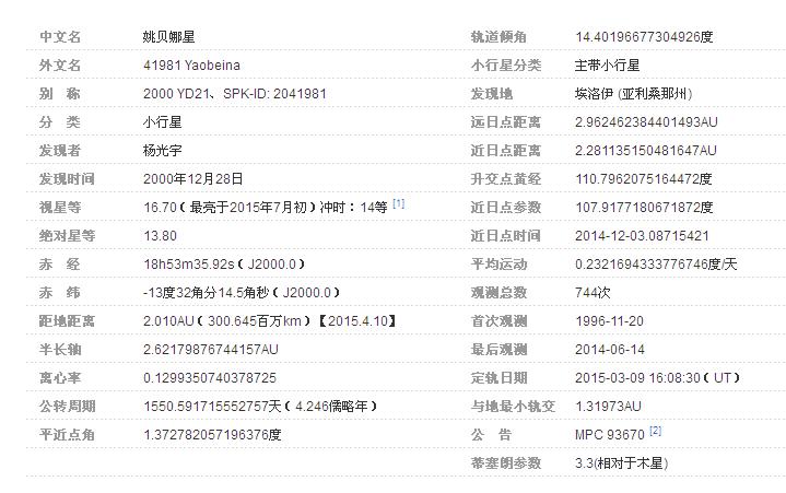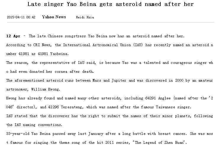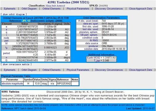 图册:4.4 国际天文联合命名第41981号小行星为姚贝娜星 (2015-04-09)