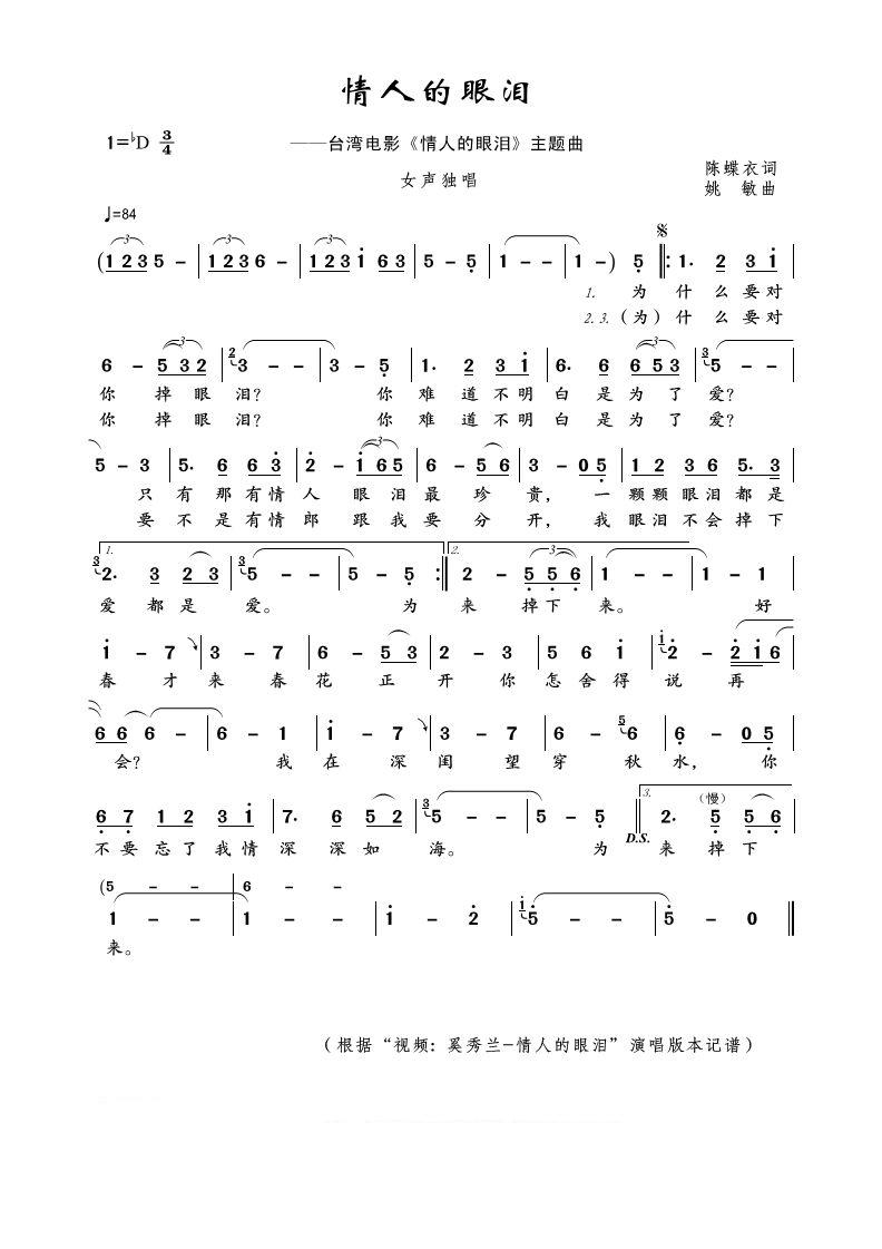 为什么要对你掉眼泪 你难道不明白是为了爱 要不是有情人眼泪才珍贵 一颗颗眼泪掉下来 掉下来 王 晰: 为什么要对你掉眼泪 你难道不明白是为了爱 只有那有情人跟我要分开 我眼泪不会掉下来掉下来 姚贝娜: 好春才来 春花正开 你怎舍得说再会 王 晰: 我在深闺望穿秋水 你不要忘了我情深深如海 为什么要对你掉眼泪 你难道不明白是为了爱 只有那有情人跟我要分开 我眼泪不会掉下来掉下来 姚贝娜: 好春才来 春花正开 你怎舍得说再会 王 晰: 我在深闺望穿秋水 你不要忘了我情深深如海 姚贝娜: 为什么要对你掉眼泪 你难道不明白是为了爱 王 晰: 要不是有情人跟我要分开 我眼泪不会掉下来掉下来