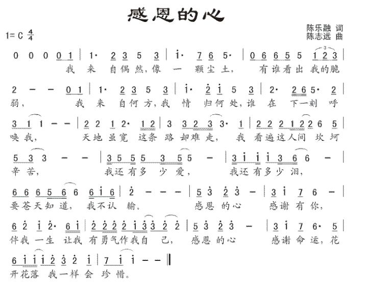 有谁看出 我的脆弱 我来自何方 我情归何处 谁在下一刻 呼唤我 天地虽宽 这条路却难走 我看遍这人间 坎坷辛苦 我还有多少爱 我还有多少泪 要苍天知道 我不认输 感恩的心 感谢有你 伴我一生 让我有勇气做我自己 感恩的心 感谢命运 花开花落 我一样会珍惜 感恩的心 感谢有你 伴我一生 让我有勇气做我自己 感恩的心 感谢命运 花开花落 我一样会珍惜 花开花落 我一样会珍惜
